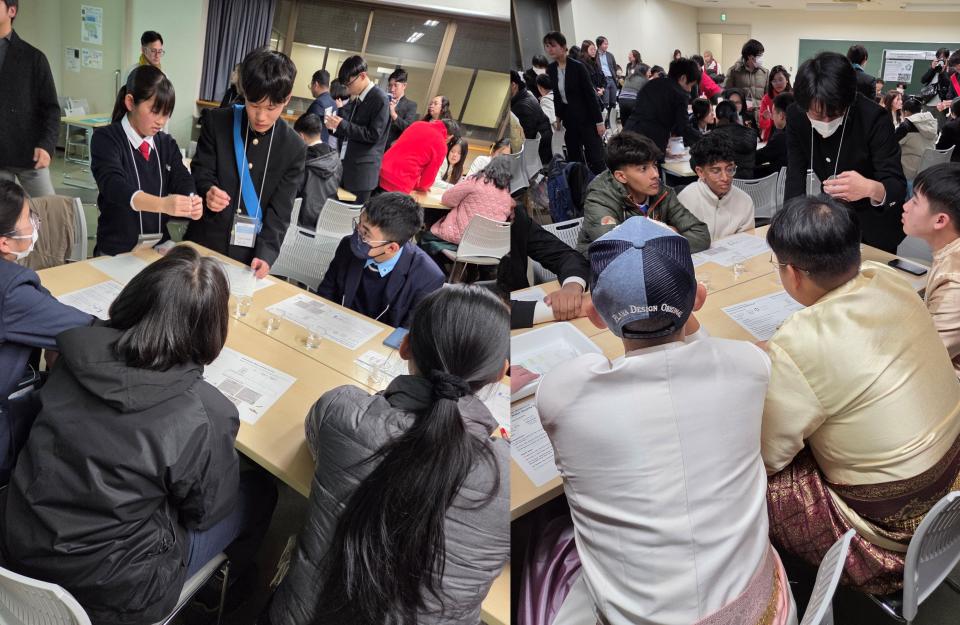 さらに、特別企画では科学研究部員が講師役をつとめ、日本を含むさまざまな国の生徒たちに水質調査の方法を伝えました。グループに分かれ、実際に用意された水を検査して産地を推測する活動では、英語での説明に苦労しながらも、相手に理解してもらえたときには嬉しそうな表情を見せていました。水質のデータを手がかりに議論を進める場面では、どの生徒も真剣に取り組み、結果の正否にかかわらず、活動そのものを楽しんでいる様子が印象的でした。
